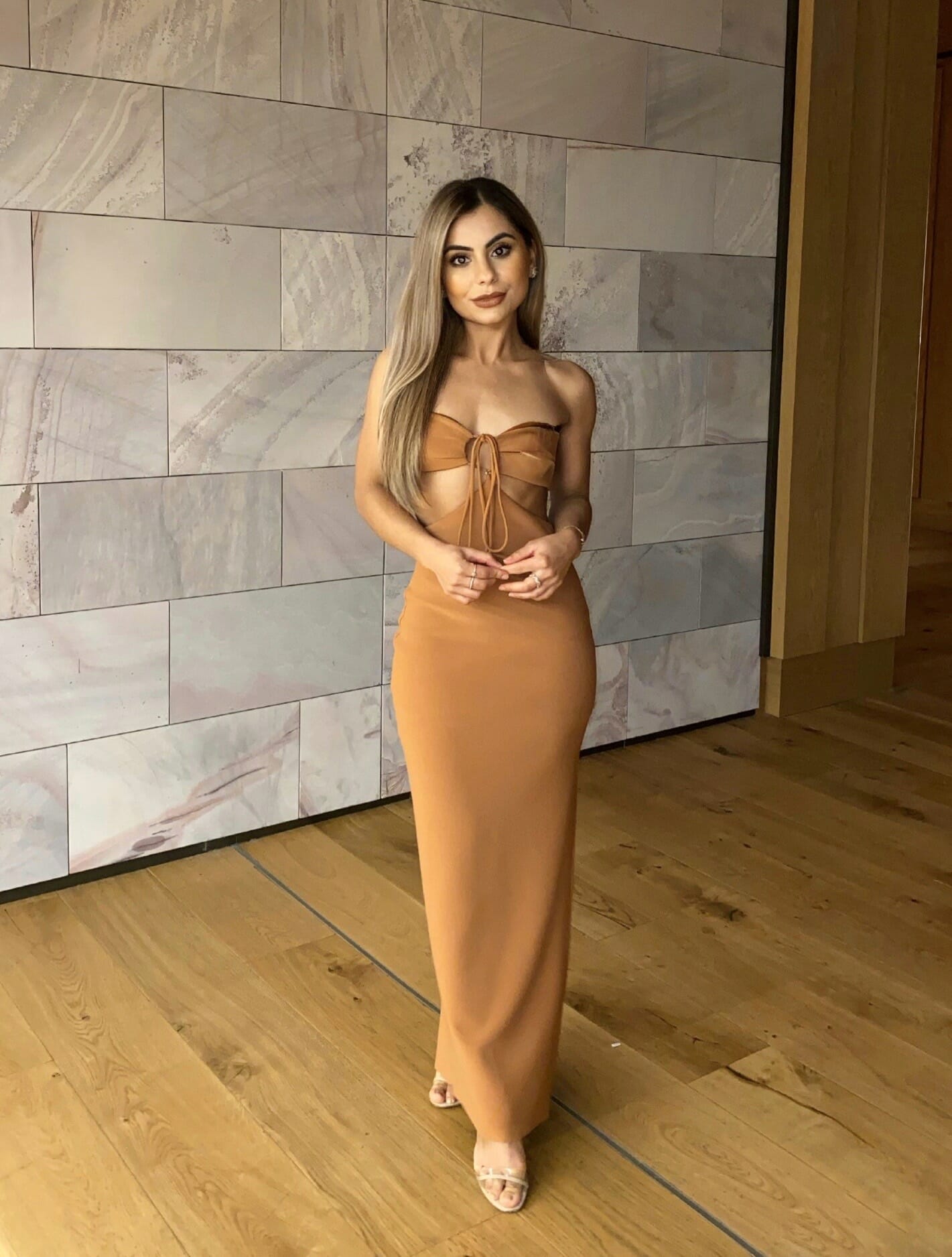 Description: Crafted from a beautiful bonded knit fabrication, this figure hugging midi dress features a soft gathered bodice with a crossover halter neckline, cut outs at the under-bust and a front gold O-ring accent.