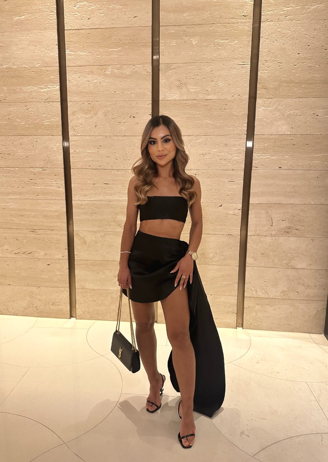 Description: The Khirzad Femme bandeau paired with asymmetric metisa skirt features gentle gathers that cascades down to a floor length tail on the side.