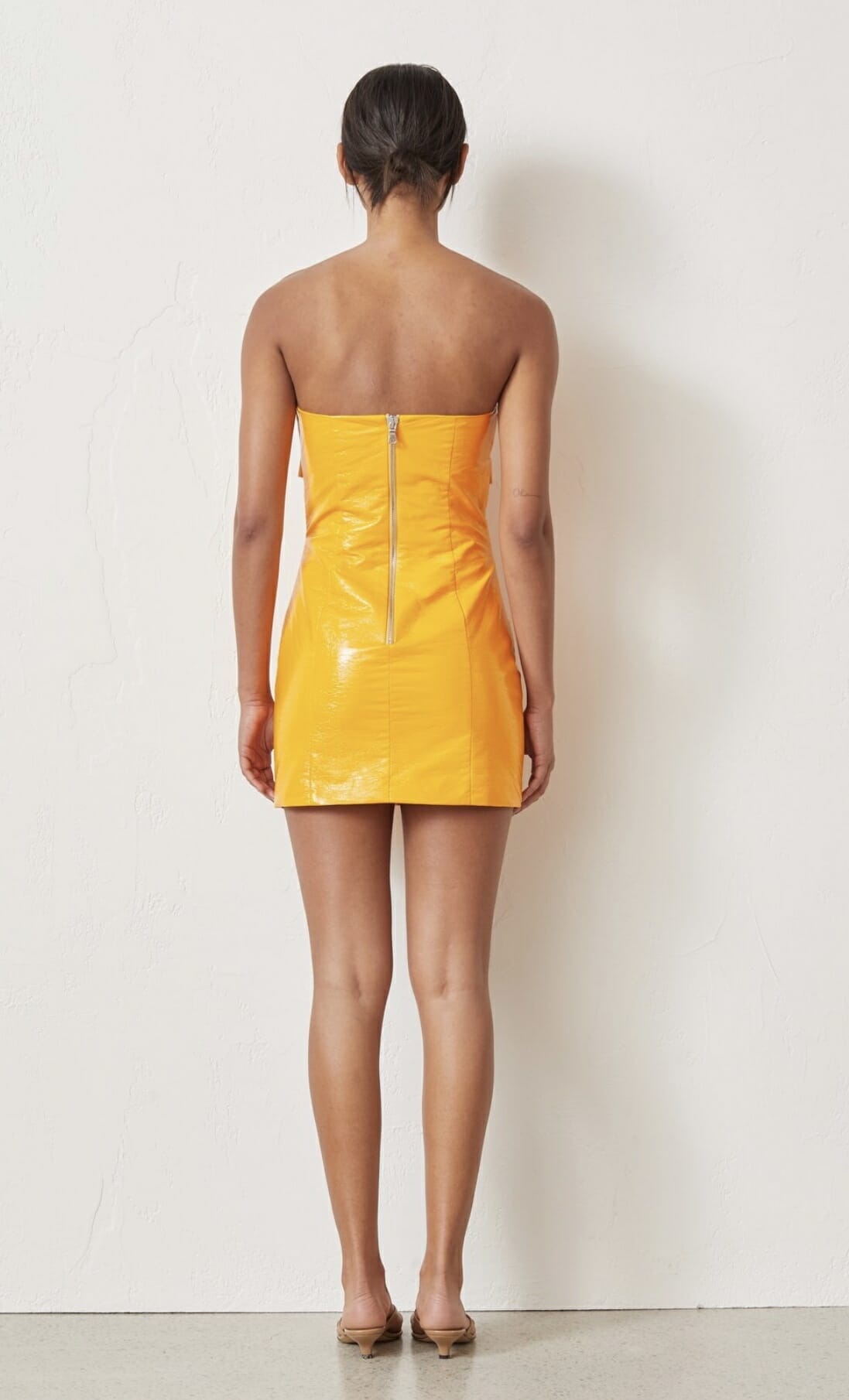 Description: PU blend strapless mini dress with a slight sweetheart neckline and gathered bust and side seam tucks.