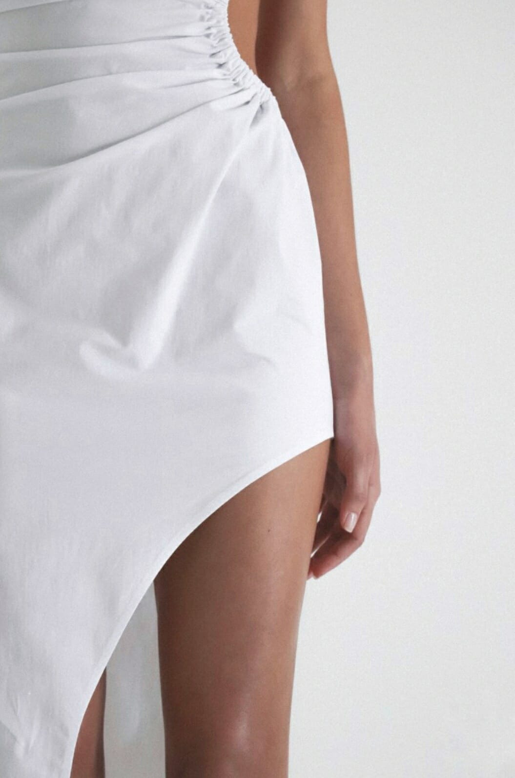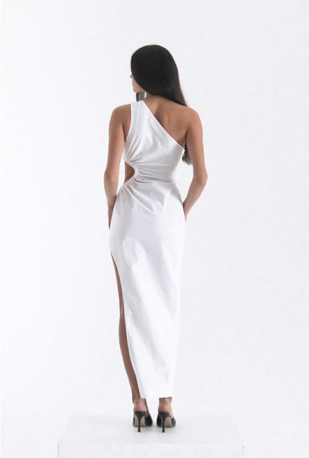 Description: A one-shoulder dress featuring an effortless waistline cut-out that is complimented by a side split.