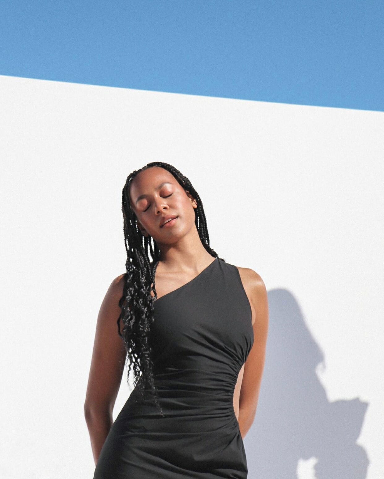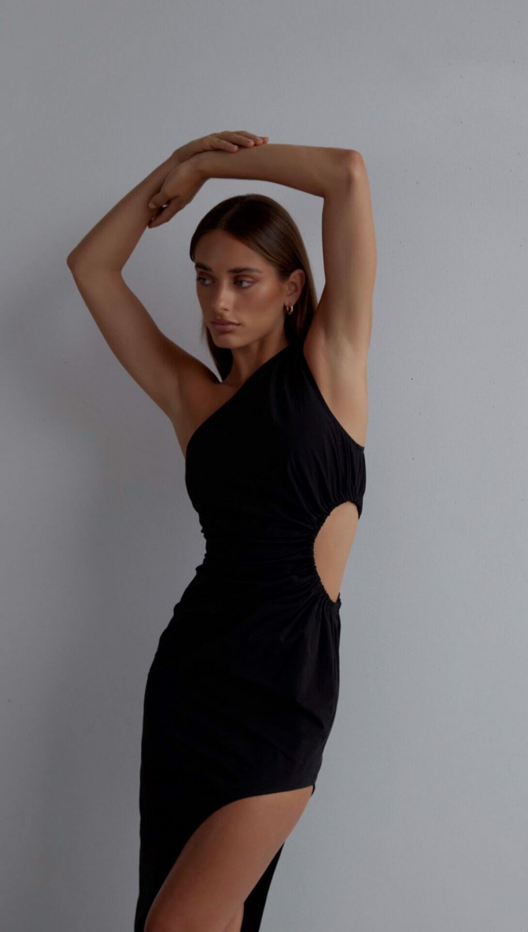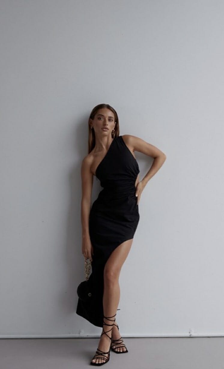Description: A one-shoulder dress featuring an effortless waistline cut-out that is complimented by a side split.