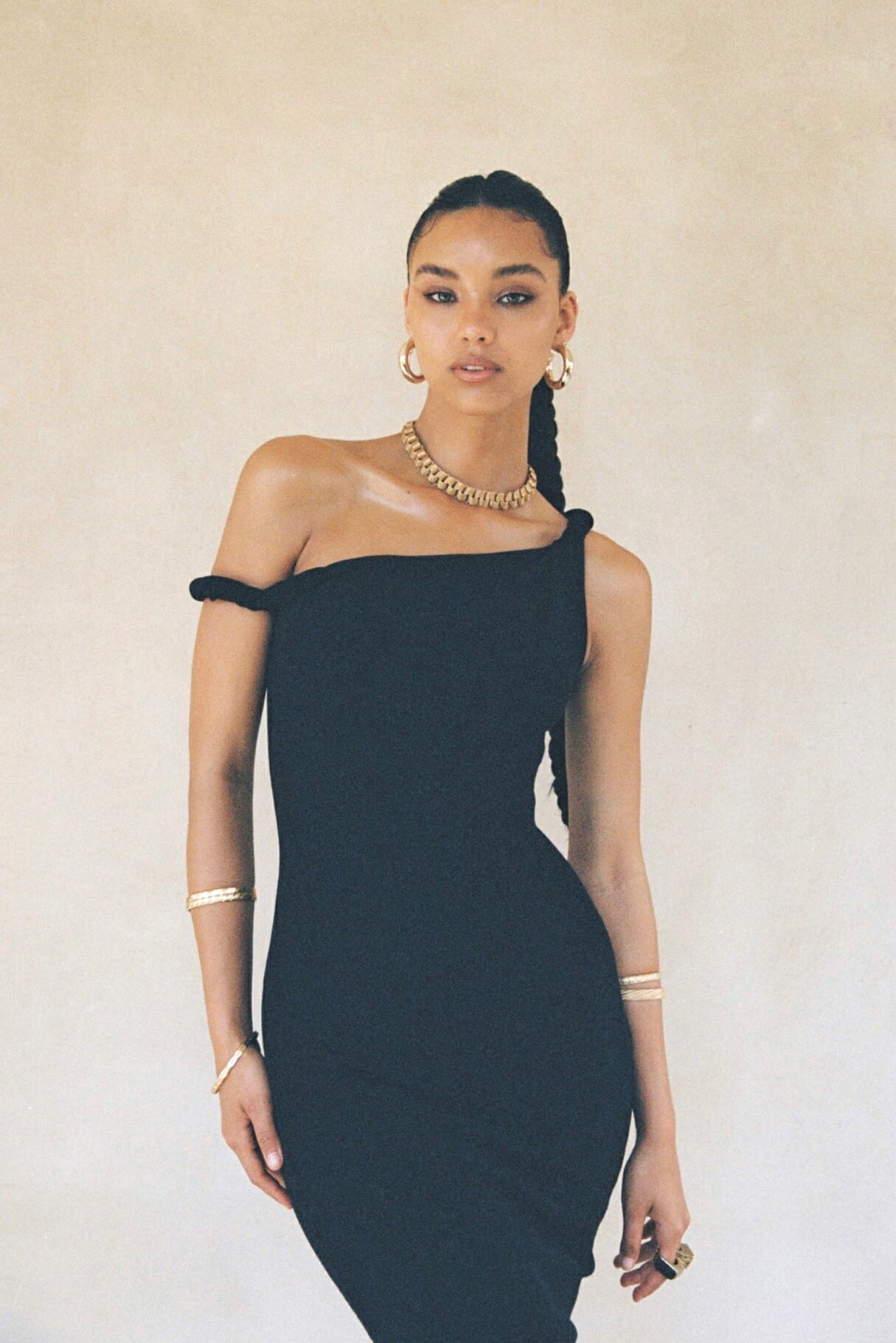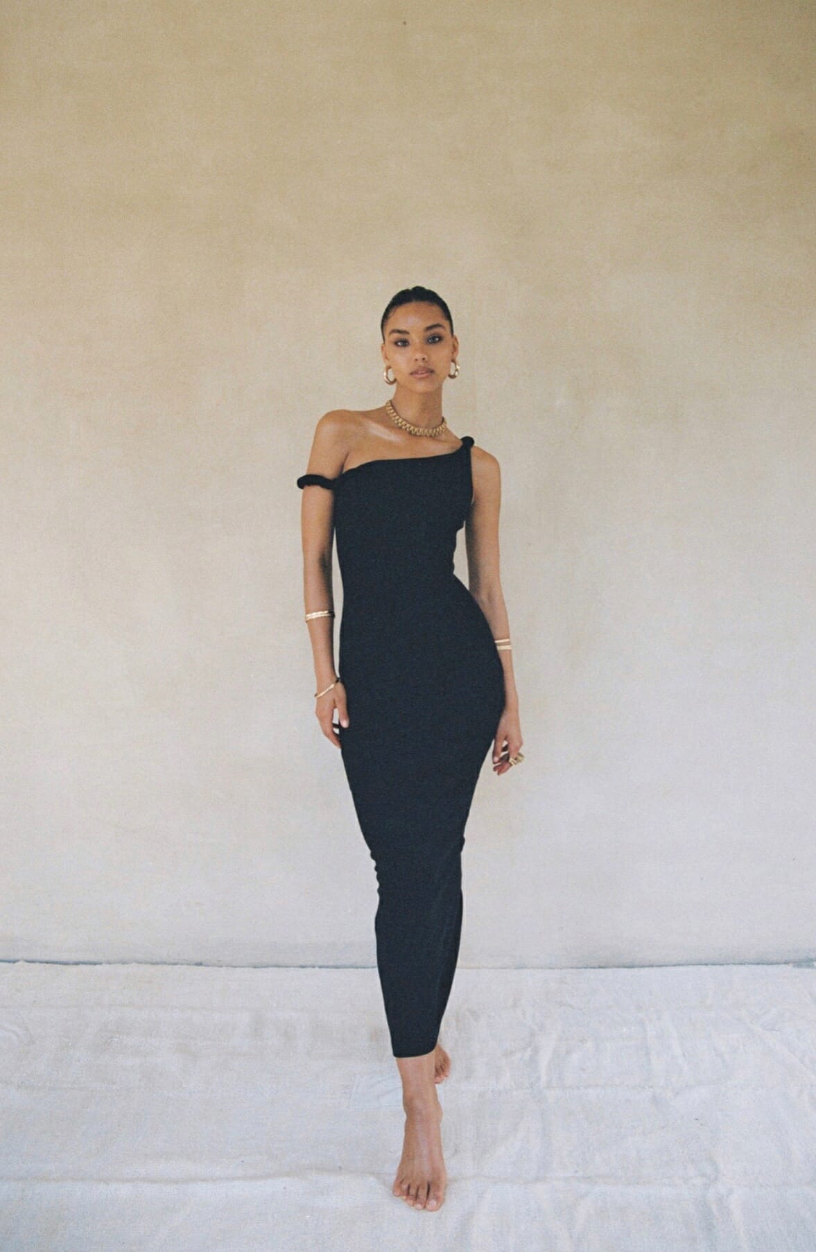 Description: The most flattering silhouette in cotton ribbed stretch Jersey. This full length number features asymmetrical neckline and our signature twist straps, one off-the shoulder exposing your décolletage.