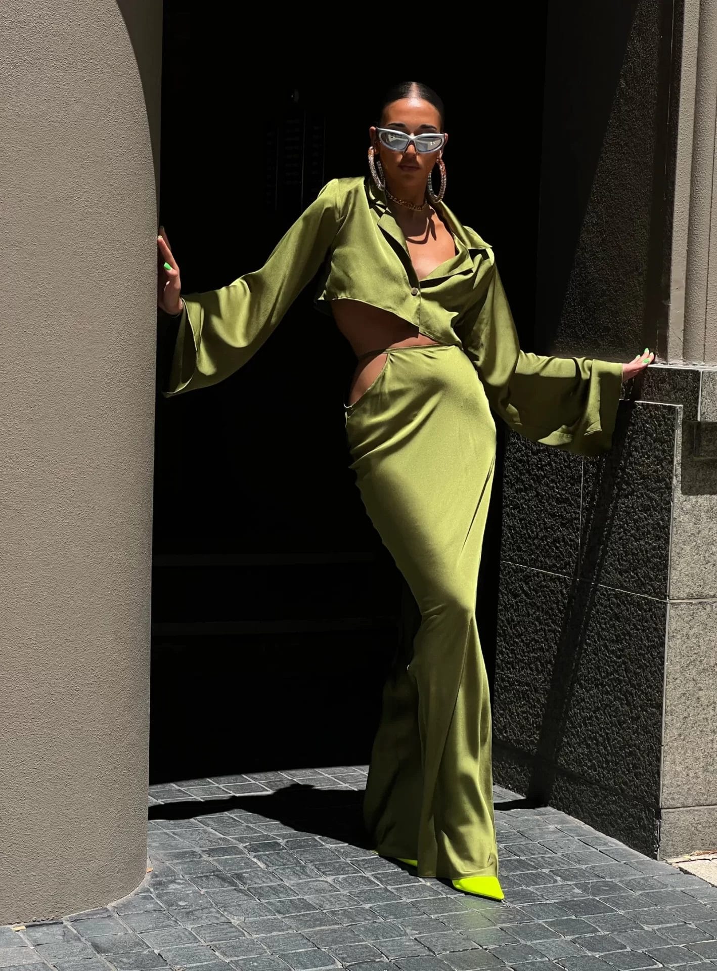 Description: The Nilo 5.0 blouse is a cropped statement piece. The Nilo 4.0 Skirt is a statement Skirt with a high side slit with a waist cut out and a side zip